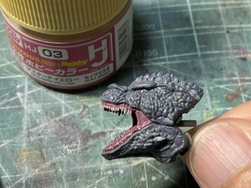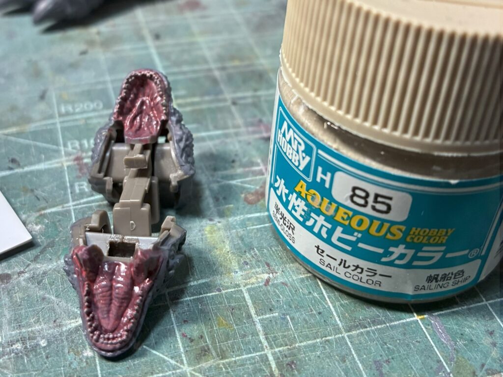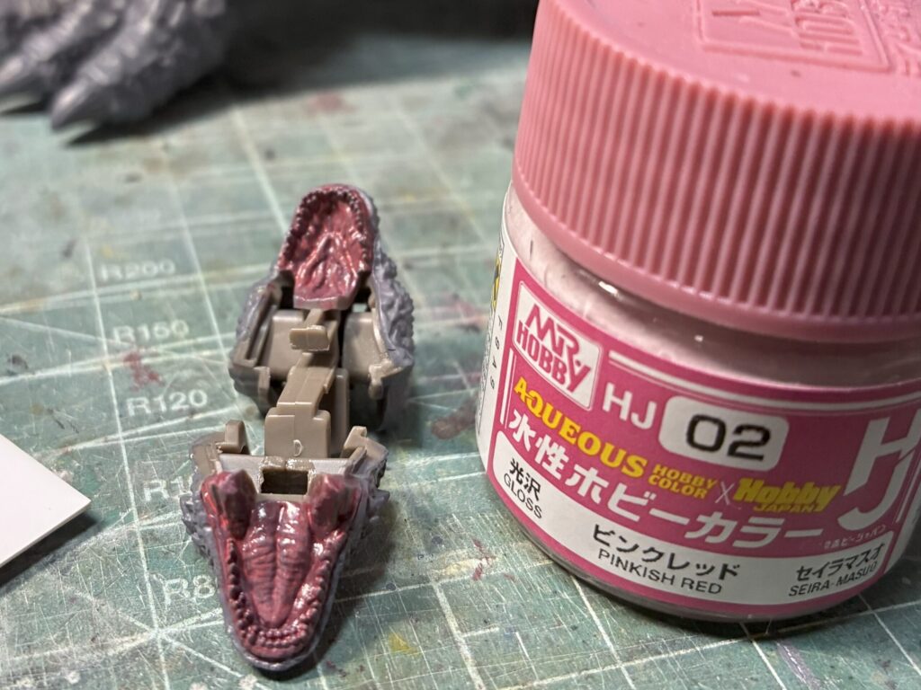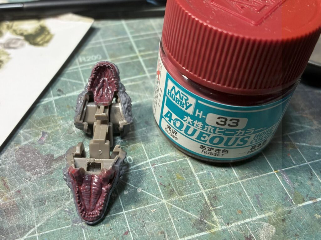 前回の時点で下地にいつも通りメカサフヘヴィーを塗り、組み立ててからでは塗装しづらそうな口の中と目を塗装してます。まずはそこから見ていきましょう!