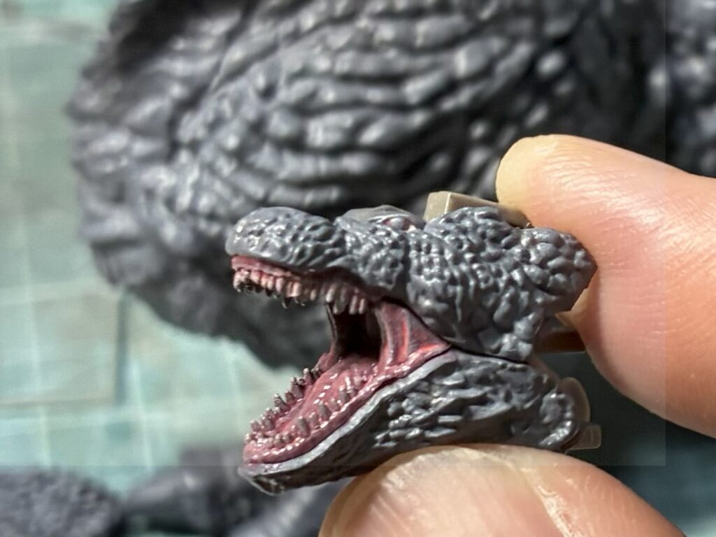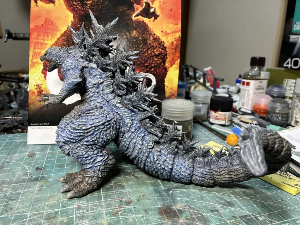 荒々しい破壊神!という感じにしたいなとか、孤高のモンスターって感じもいいなとか、いろんな想像を巡らせていて、気が付いたら半分青系、半分赤系に塗ってました!写真もほぼ撮ってないしwwwそんなわけで写真のように見る方向で違う表情のあるゴジラになりました!!