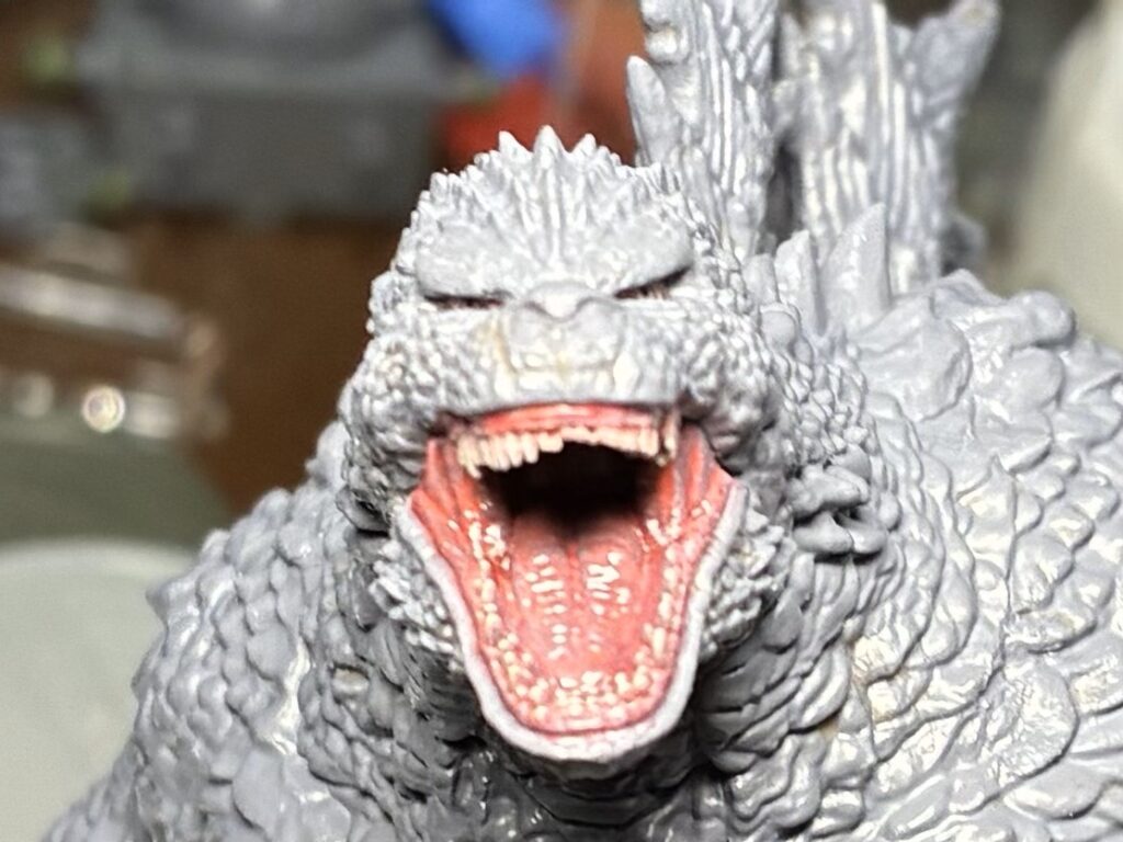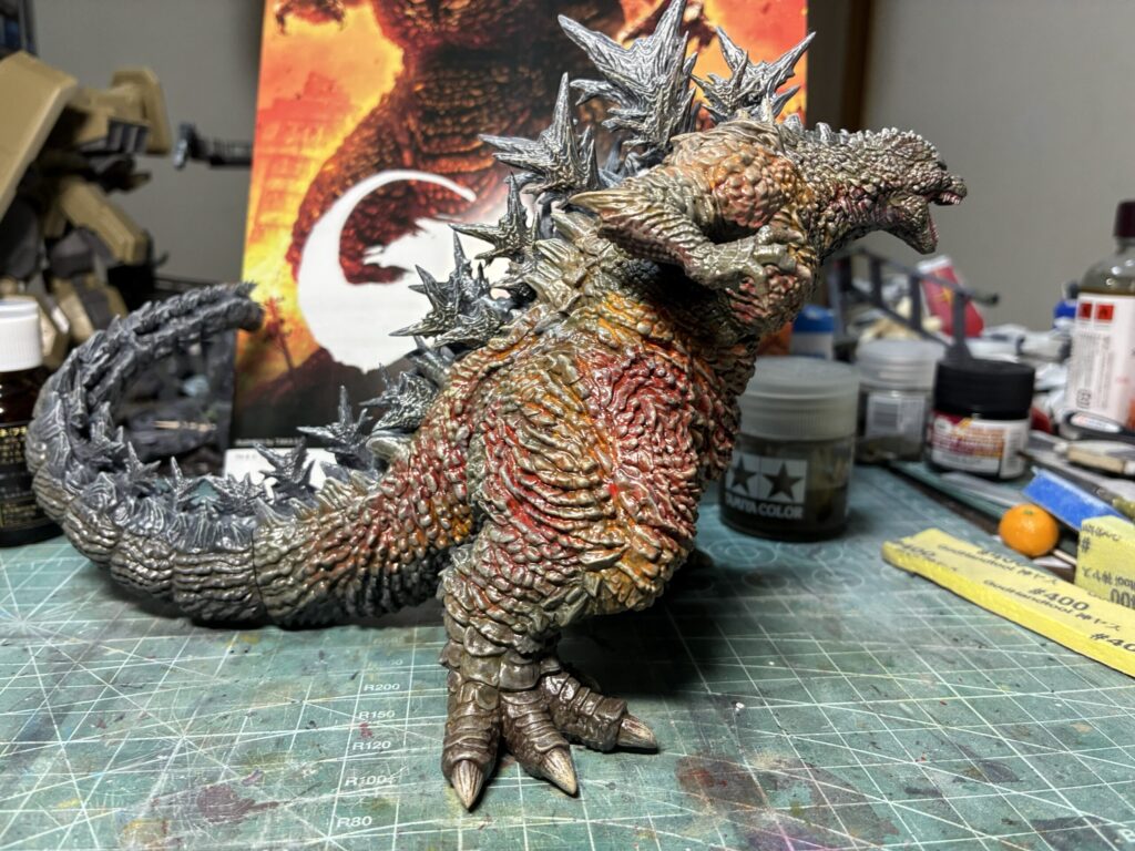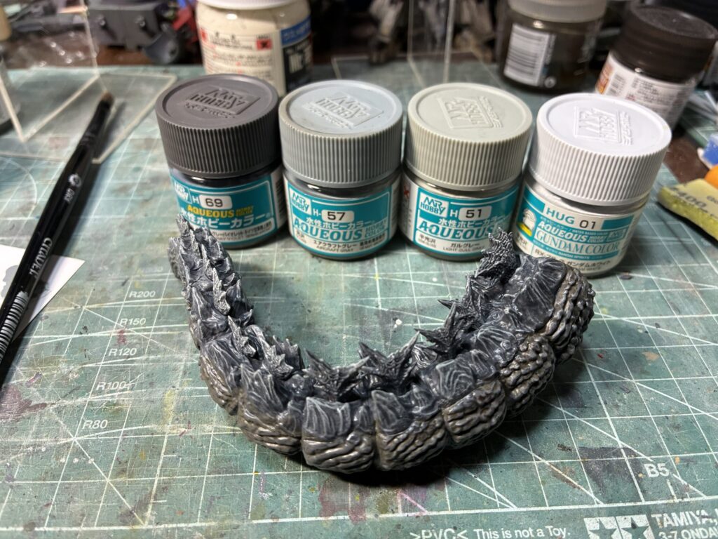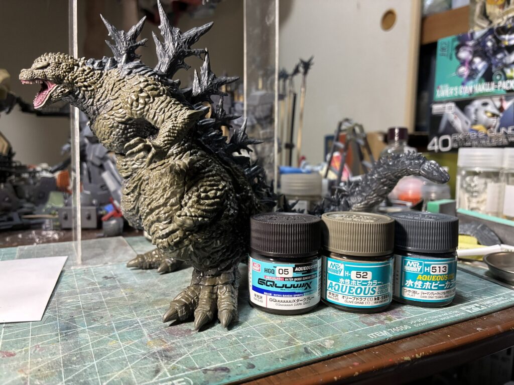 ゴジラって濃いグレーの印象ですが、それだけだと生きてる感じが出ないかなぁと思い、明るいところはいったん茶色に振っていきました。影になる部分にジャーマングレー、足回りに最近出たGQグレーを塗りました。このGQグレー、何とも言えない絶妙な色なので今後も多様すると思います。