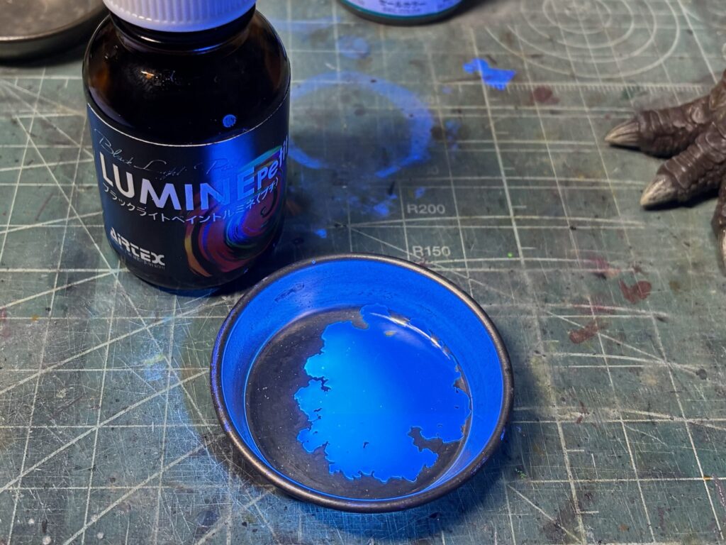 そしてもう一つ、最大の注意点!!ブラックライトをつけないと何も見えないwww思わぬところについていても気づかない!!今回、指にちょこっとついてた蛍光塗料がゴジラについてしまって一部塗りなおすという事故が発生しました。100%私が悪いのですが、何せ見えないので要注意です!