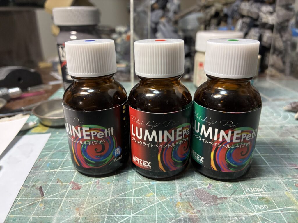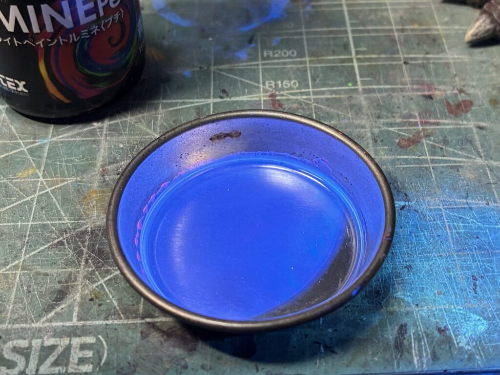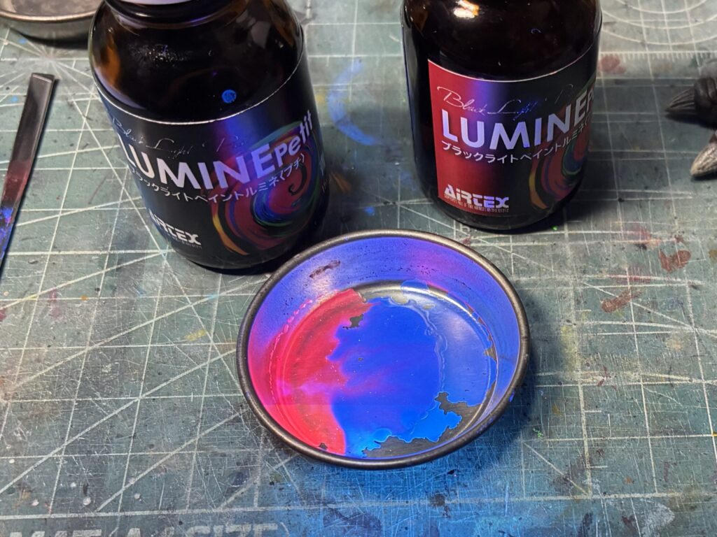 こちら、蛍光塗料ですが、基本的には透明です。ブラックライトをあてるとガンガンに光ります。しかも、青、緑、赤の3色があり、調色することで光の色が作れてしまうスグレモノ!!!!