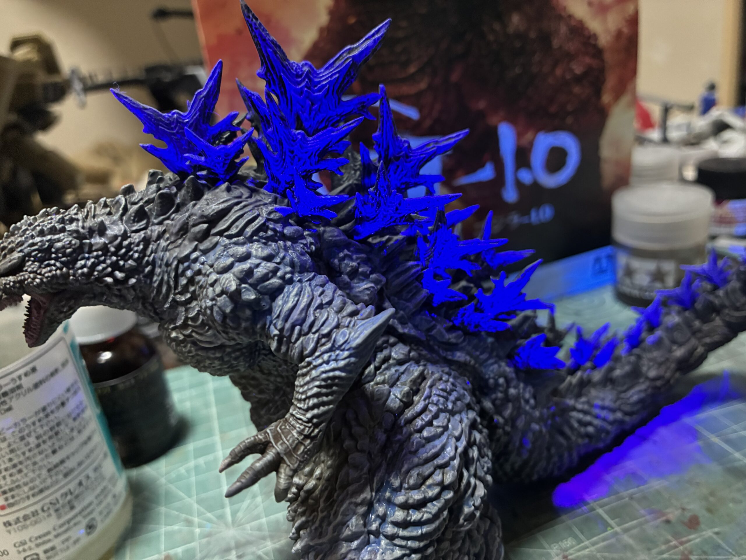 そしてもう一つ、最大の注意点!!ブラックライトをつけないと何も見えないwww思わぬところについていても気づかない!!今回、指にちょこっとついてた蛍光塗料がゴジラについてしまって一部塗りなおすという事故が発生しました。100%私が悪いのですが、何せ見えないので要注意です!
