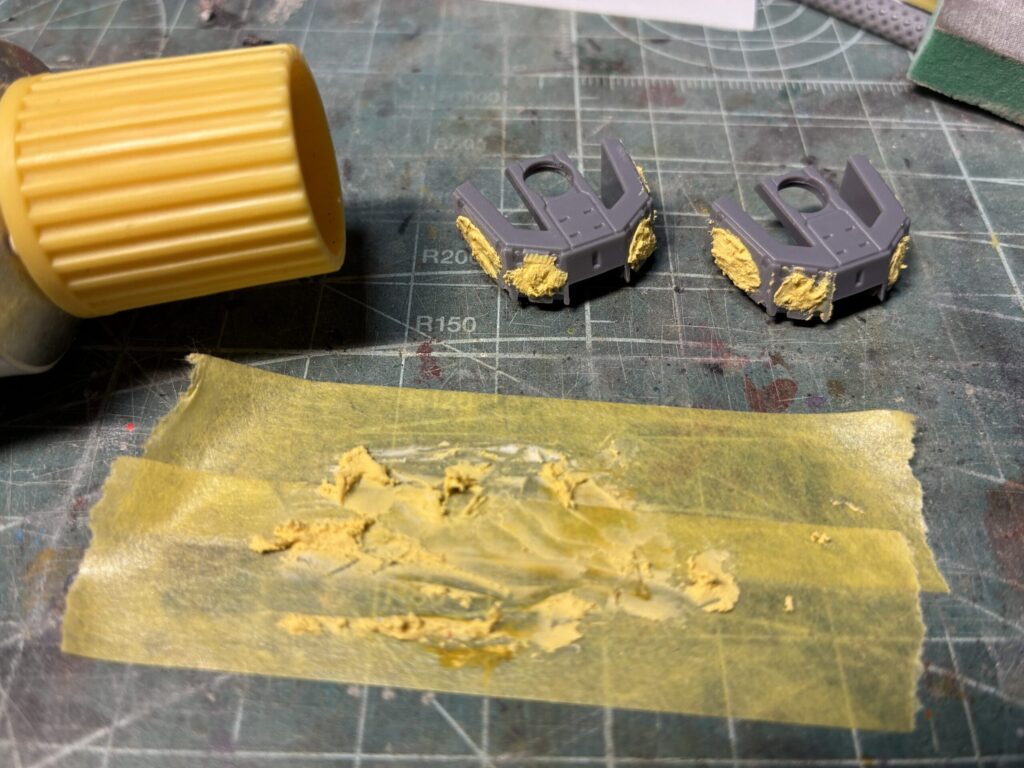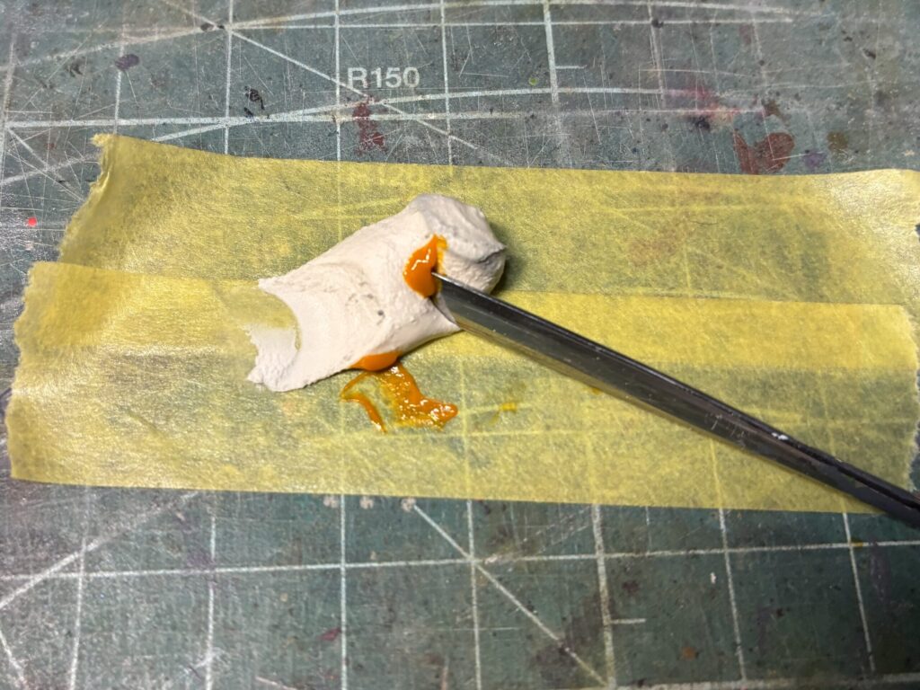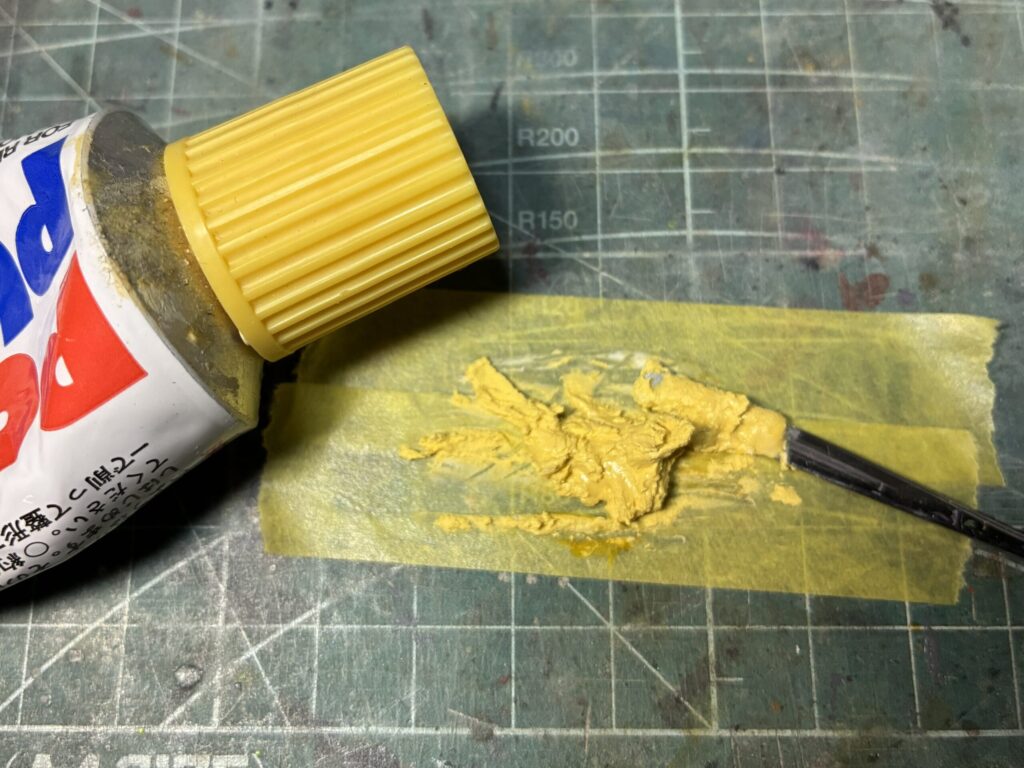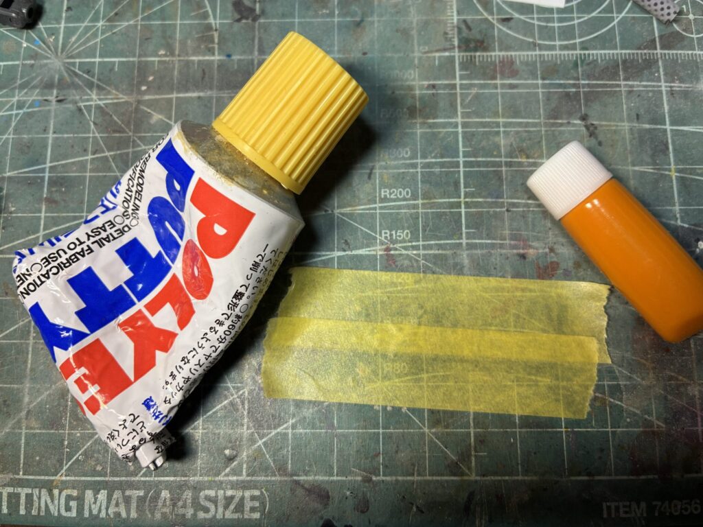私はタミヤさんのポリパテを愛用しています。入手しやすく使いやすい、ご家庭に1本、備えておきましょう!!白いペーストとオレンジの硬化剤がセットになっています。それぞれのチューブから同じ長さを出して混ぜると丁度いい加減になるように、チューブの口が設計されています。私はカッティングマットの上にマスキングテープを貼って、その上に出して混ぜてます。